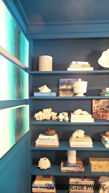 The first room when you come in from the porch. What do you think? I love the denim slipcovers and the curtains and the way the shelves are arranged!