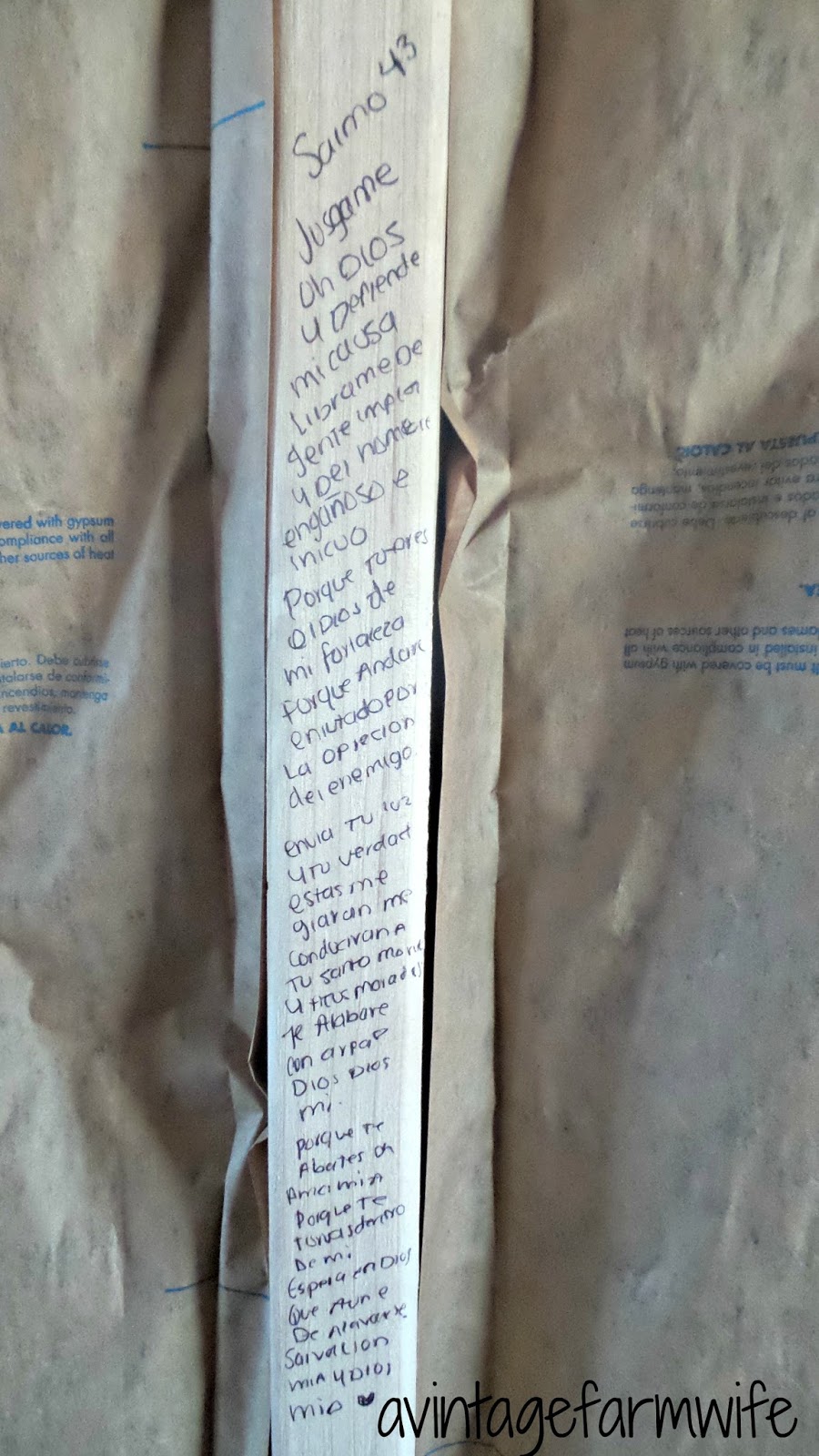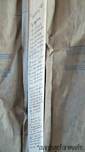 27. Walls covered in scripture written in English and Spanish before the dry wall went in place